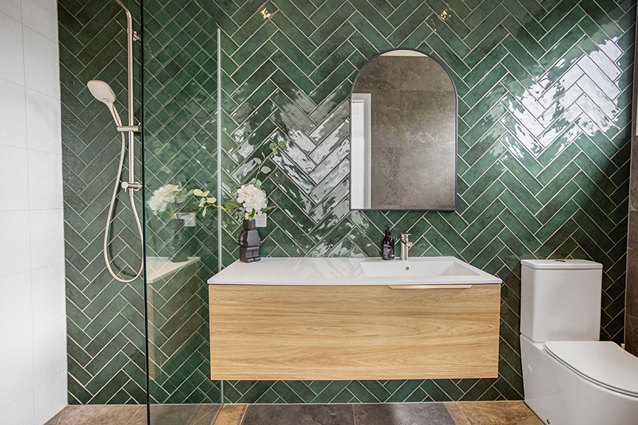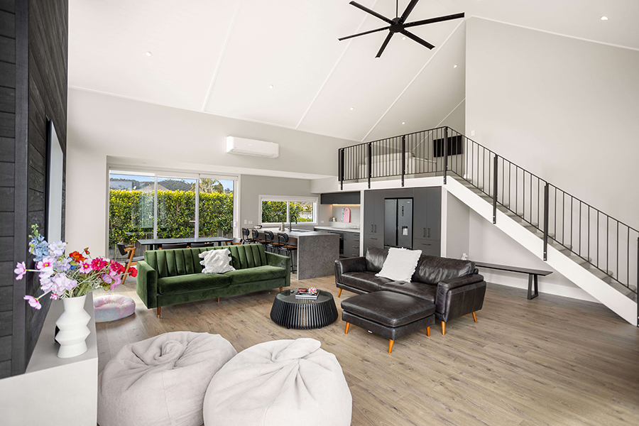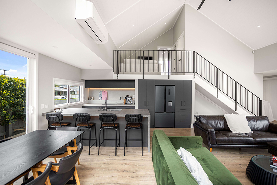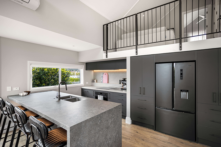 The kitchen combines practicality with contemporary design, offering a large stone island, dark cabinetry, and quality appliances. Bathrooms are finished with modern tiling, including a standout green herringbone feature in the ensuite. A mezzanine loft above the kitchen adds extra flexibility, whether for guests, an office, or a cosy retreat.