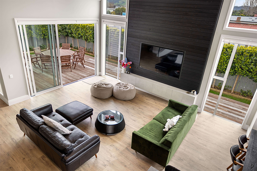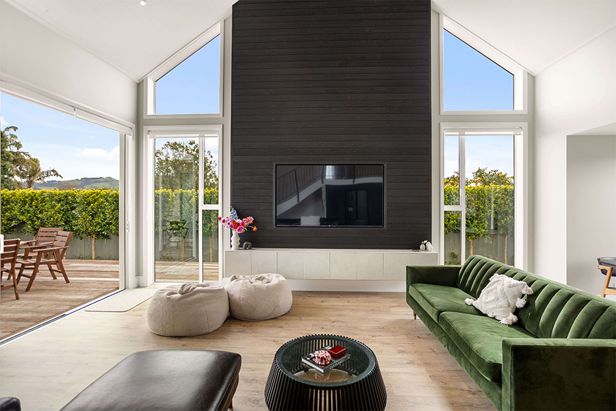 From the outside, the home features timeless weatherboard cladding, a pitched roofline, and a warm cedar-look garage door, giving it strong street appeal. Inside, the open-plan living area showcases raked ceilings, full-height windows, and a striking feature wall, creating a light-filled hub that flows seamlessly onto a spacious deck – perfect for entertaining and soaking up the sun.